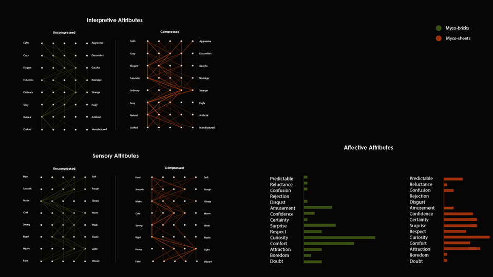 The survey compared two versions of mycelium samples: uncompressed (myco-sheets) and compressed (myco-sheets). It drew participation from 40 graduate students representing various departments and providing diverse perspectives. The participants’ responses indicated a significant interest among students in further exploring the materials. 62% of the participants expressed their interest for material testing and prototyping and requested samples of custom composites. This enthusiastic response is a testament to the growing demand and fascination surrounding mycelium within the design field.